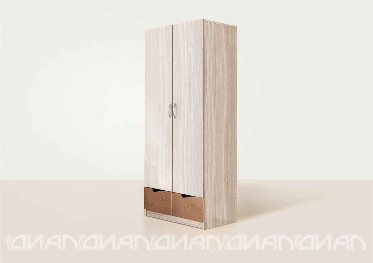 - шкаф 2-х створчатый. За распашными дверями находятся антресольная полка и металлическая штанга для размещения одежды, внизу два выдвижных ящика на роликовых направляющих;