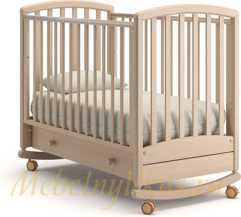 Округлые мягкие формы кроватки-качалки со съемными колесами «Дашенька» Гандылян насытят пространство детской комнаты особым уютом и гармонией.