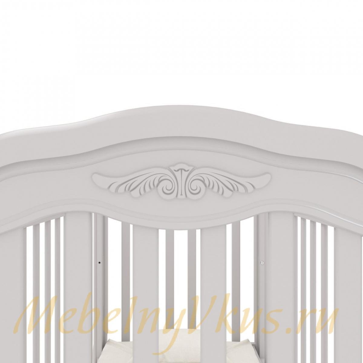 Плавные линии форм, искусная резьба и воздушность конструкции в целом — это отличительные черты дизайна детской кроватки-качалки со съемными колесами «Шарлотта» Гандылян.