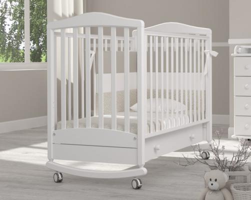 Кроватка имеет дуги-полозья для раскачивания и две пары колес на ножках, что облегчает ее перемещение в комнатном пространстве.