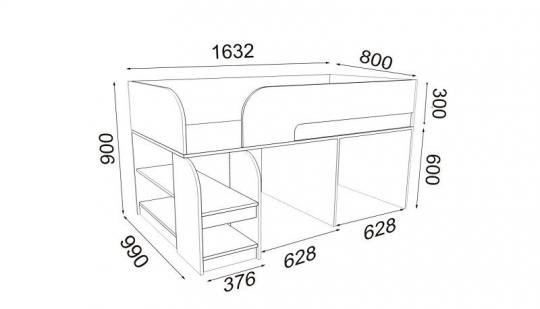 Невысокая кровать чердак со спальным местом 800х1600, которое находится наверху, а снизу встроены рабочий стол, где малыш может "работать", рисовать и двустворчатый шкаф, внутри которого полка для хранения игрушек, книжеки прочих мелочей. Лестница модели может распологаться как слева так и справа. Она сделана в виде открытого стеллажа, где также можно положить вещи.