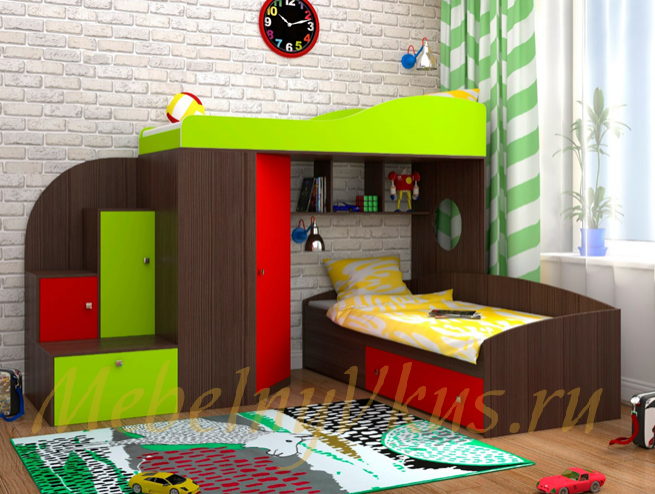 Кровать-чердак "Кадет 2" прекрасно подойдет для двоих детей. Разнообразная цветовая гамма порадует взыскательных детей и взрослых. Сочетание цветов может быть как трехцветным так и двухцветным.
