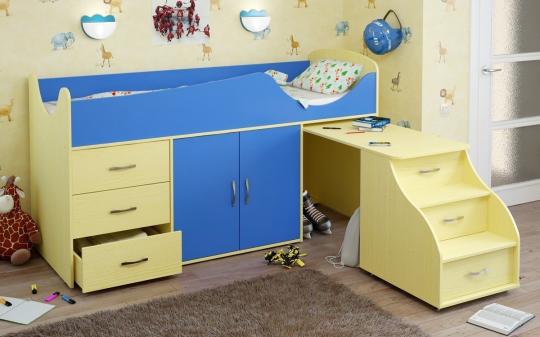 Кровать-чердак "Карлсон Мини-10" отличается, в первую очередь, оригинальным дизайном и практичностью. При небольших габаритах эта модель совмещает в себе удобную кровать, место для хранения вещей (три выдвижных ящика и встроенный комод с дверцами) и рабочую станцию. Письменный стол соснащен колесиками, благодаря чему элемент задвигается под кровать, тем самым позволяя забраться на второй ярус, и существенно экономит место.