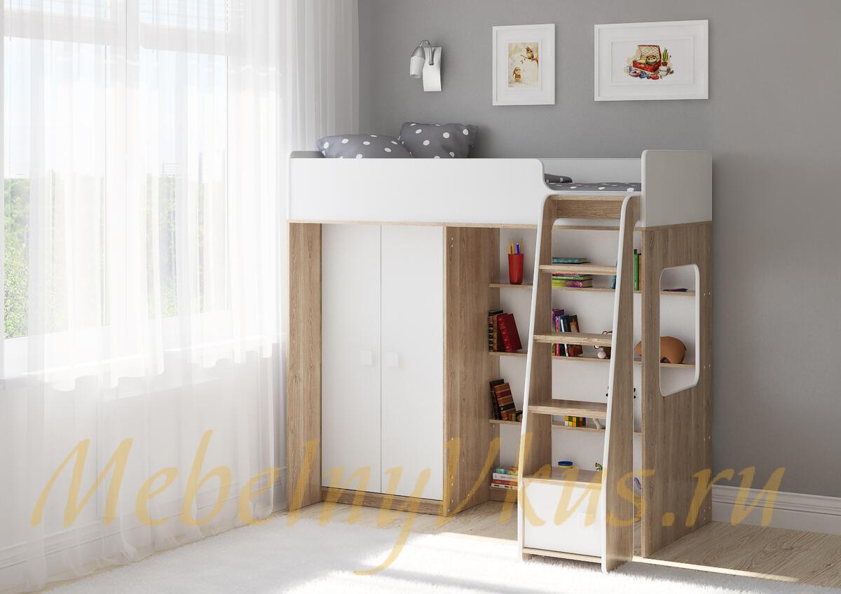 Кровать чердак Легенда A601.1 – великолепный комплект мебели, решение для площади малых габаритов, экономия пространства. Комплект занимает немного места - решение для площади малых габаритов,экономия пространства. Спальное место: 175×75. Высота кровати чердака всего 1677 мм. Данная модель представлена в двух видах расцветки: белый и сонома-светлый/белый! Под спальным местом располагается игровая зона – свой уголок для ребенка. В игровой зоне располагается стеллаж,отлично подходящий для хранения игрушек. Это очень удобно для поддержания порядка и сортировки предметов. Вместительный шкаф для хранения одежды, белья,игрушек или иных вещей. Световое окно прямоугольной формы - дополнительное освещение, элемент для игры и возможность родителям наблюдать за ребенком. В комплект входит прямая лестница,она имеет место для хранения, с дверкой и ручкой плавной формы, без острых углов. Мягкий противоударный кант – дополнительная безопасность для детей. По вашему выбору комплект может быть собран как на левую, так и на правую сторону.
