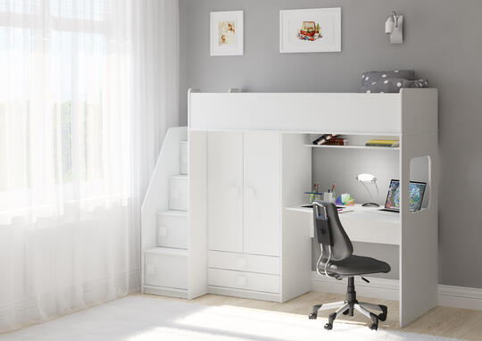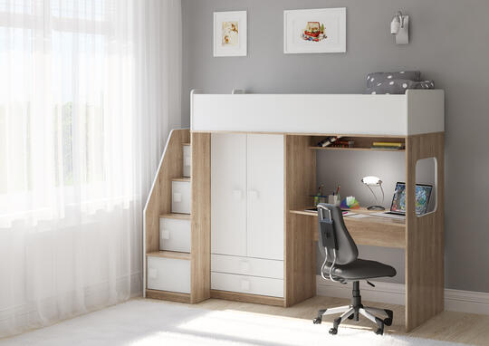 Кровать чердак Легенда A606.3 – великолепный комплект мебели, решение для площади малых габаритов, экономия пространства. Комплект занимает немного места - решение для площади малых габаритов,экономия пространства. Кровать чердак с большим спальным местом 1750×750. Высота кровати чердака всего 1677 мм. Данная модель представлена в двух видах расцветки: белый и сонома-светлый/белый! Учебная зона со столом под спальным местом открывает возможности для письменных работ,а также здесь удобно расположить ноутбук. Вместительный шкаф для хранения одежды, белья,игрушек или иных вещей.Внизу шкафа располагается выкатные ящики,в которых можно хранить отдельно мелкие предметы.Расположение ящиков позволяет ребенку легко извлекать необходимые вещи самостоятельно. Световое окно прямоугольной формы - дополнительное освещение, элемент для игры и возможность родителям наблюдать за ребенком. Интегрированная угловая лестница оснащена боковым бортиком и местами для хранения с ручками плавной формы, без острых углов. Мягкий противоударный кант – дополнительная безопасность для детей. По вашему выбору комплект может быть собран как на левую, так и на правую сторону.