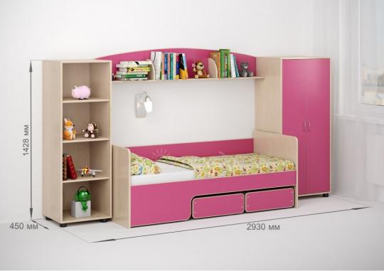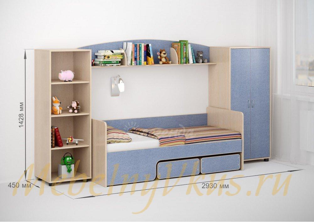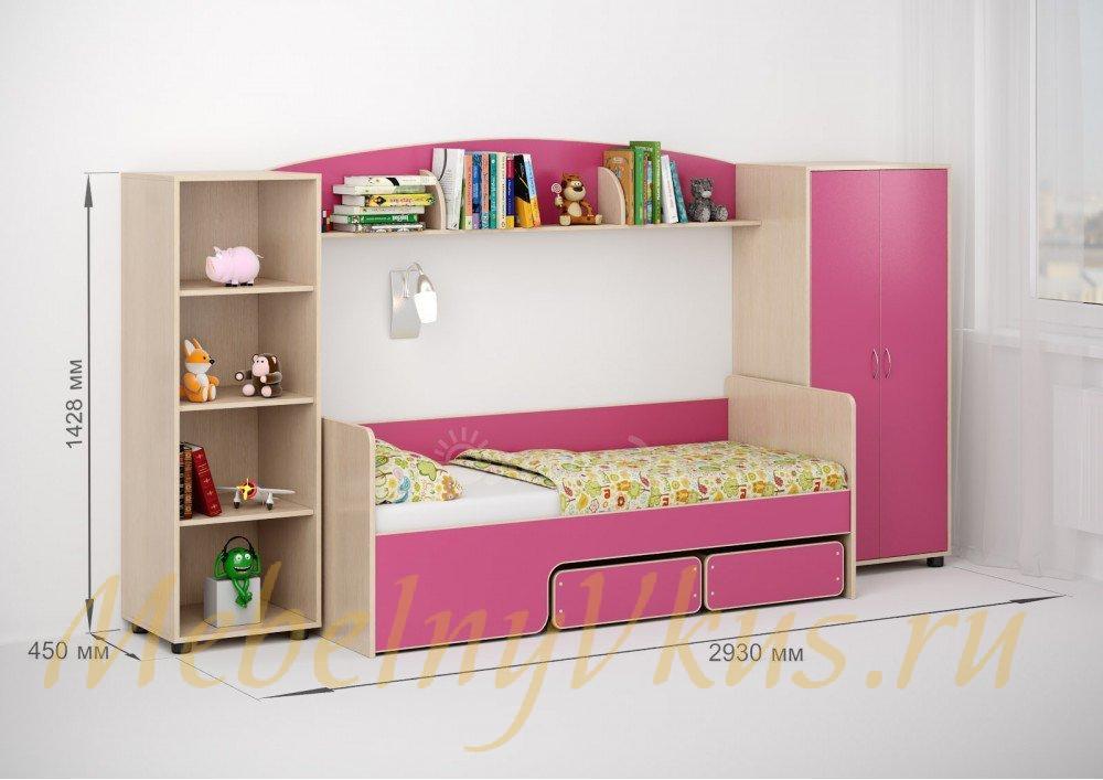 Между шкафом и стеллажом,под полкой располагается центральная часть комплекта - детская кровать Легенда 40 – это удивительная кровать-трансформер,которая имеет четыре варианта сборки!В набор также входит бортик Л-02.
