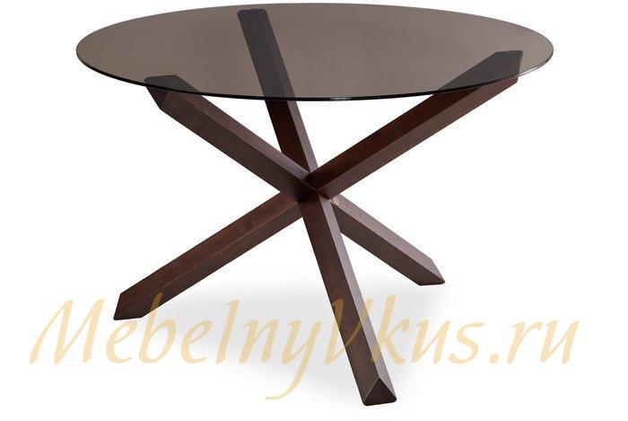 Необычное основание из массива дерева в виде трёх перекрещенных элементов надёжно удерживает стеклянную столешницу с благородной тонировкой.