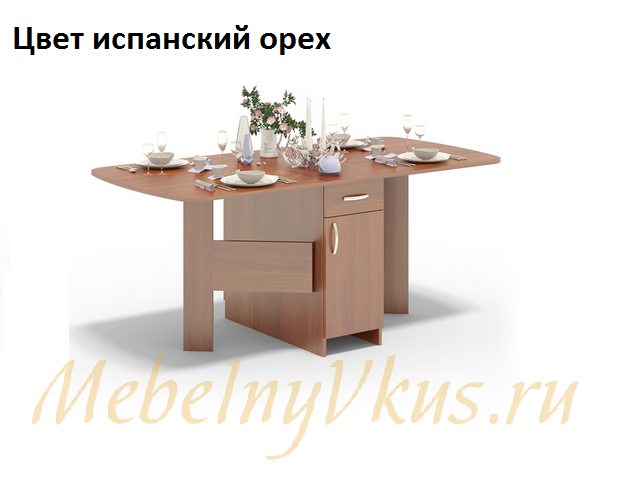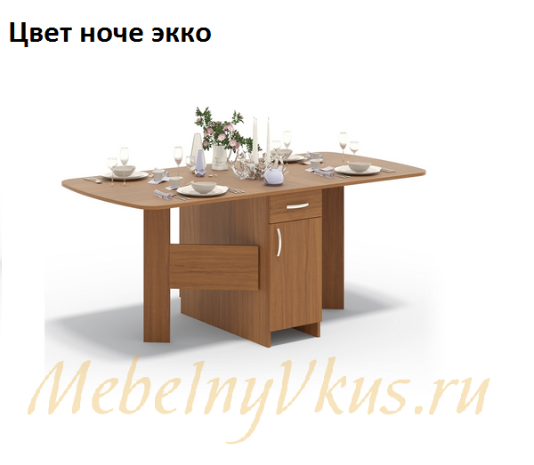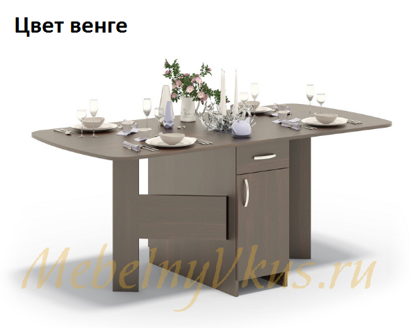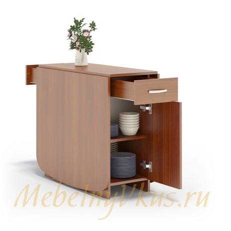 Стол-книжка СП-09.1 с ящиками и полочками. В собранном виде может использоваться в качестве тумбы (ширина всего 394 мм). А при необходимости превращается в полноценный обеденный стол шириной 1760 мм.