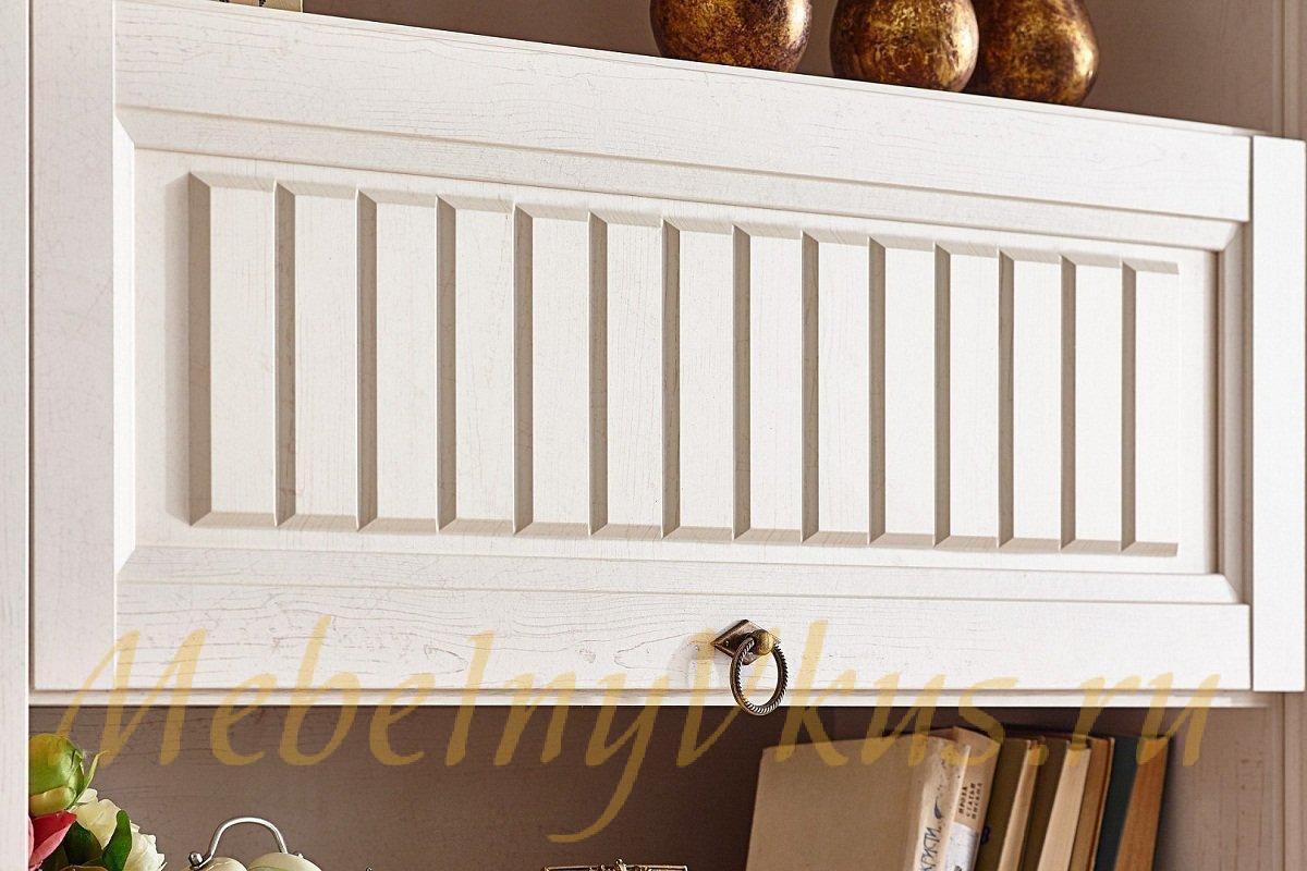 Светлый оттенок мебели и эффект состаренного дерева на фасадах помогают создать интерьер, располагающий к комфортному отдыху в кругу семьи или гостей. Цоколь, делает гостиную практичной – он помогает предотвратить попадание мелких предметов под мебель. Резной карниз украшает коллекцию, подчеркивает стиль «Прованс» и объединяет модули в целостную гармоничную композицию. А для аккуратной стыковки двух частей карниза в коллекции предусмотрены соединители карниз.