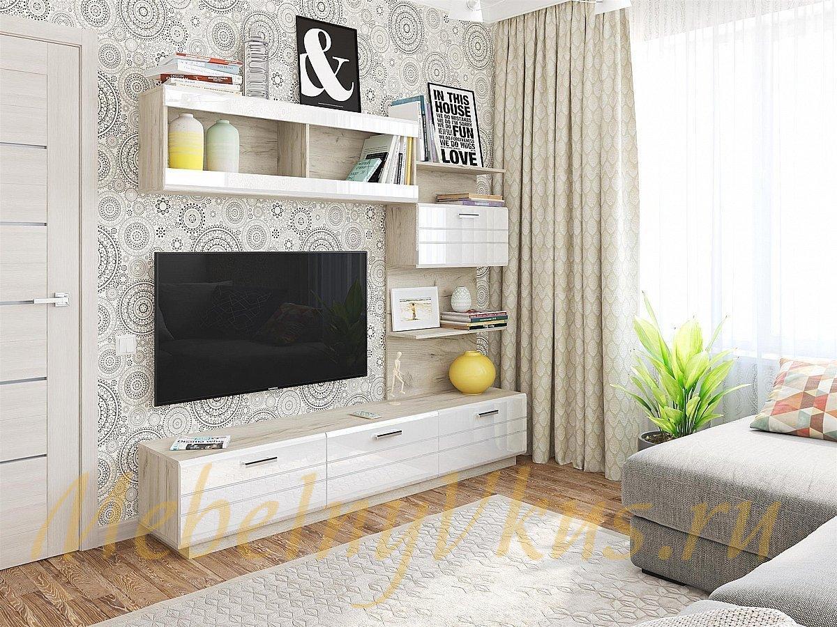 Новинка 2018 года! Современная и небольшая стенка Глейс-01 идеальна для маленькой комнаты. Фасады выполнены в белом глянце. Большая ниша для ТВ 1000х1300 мм.