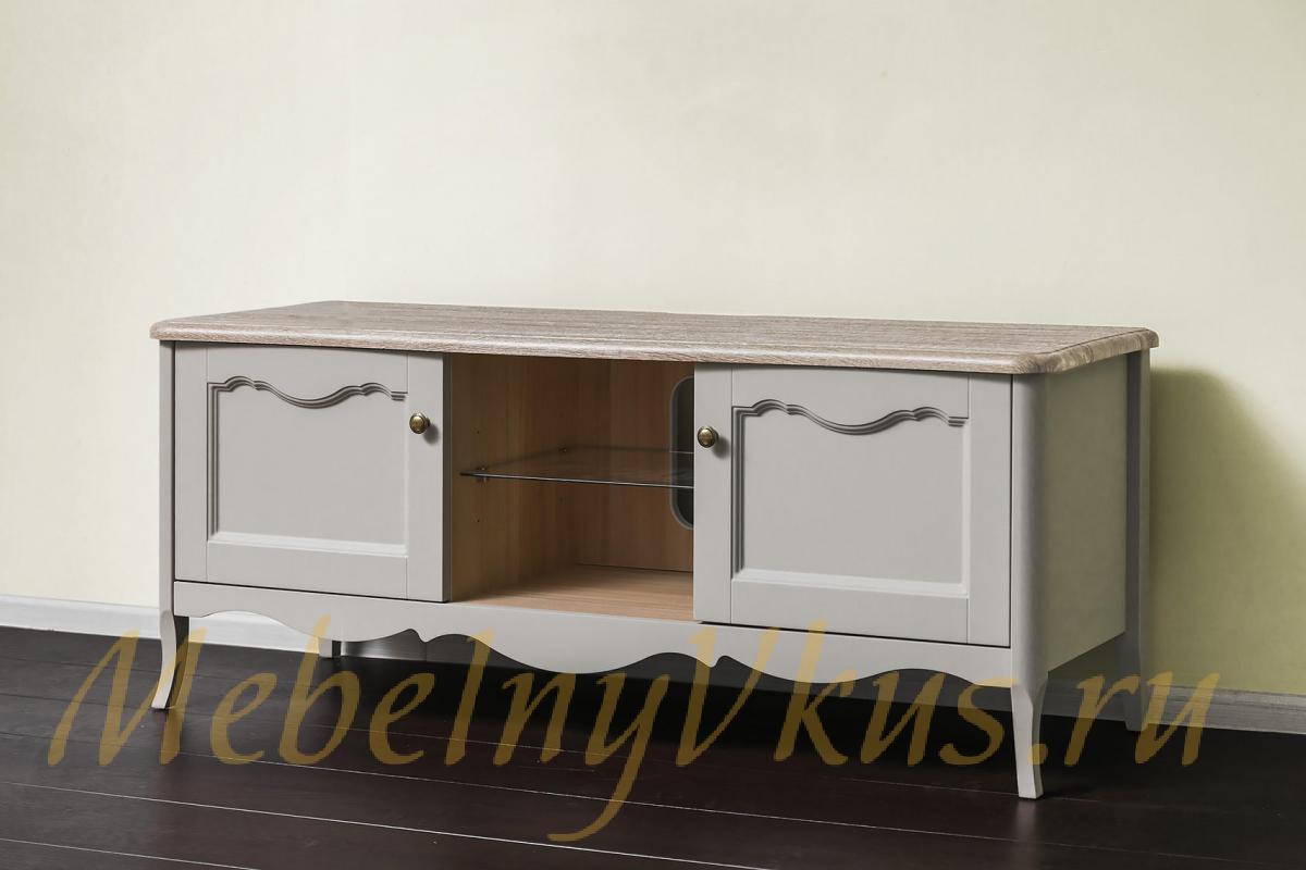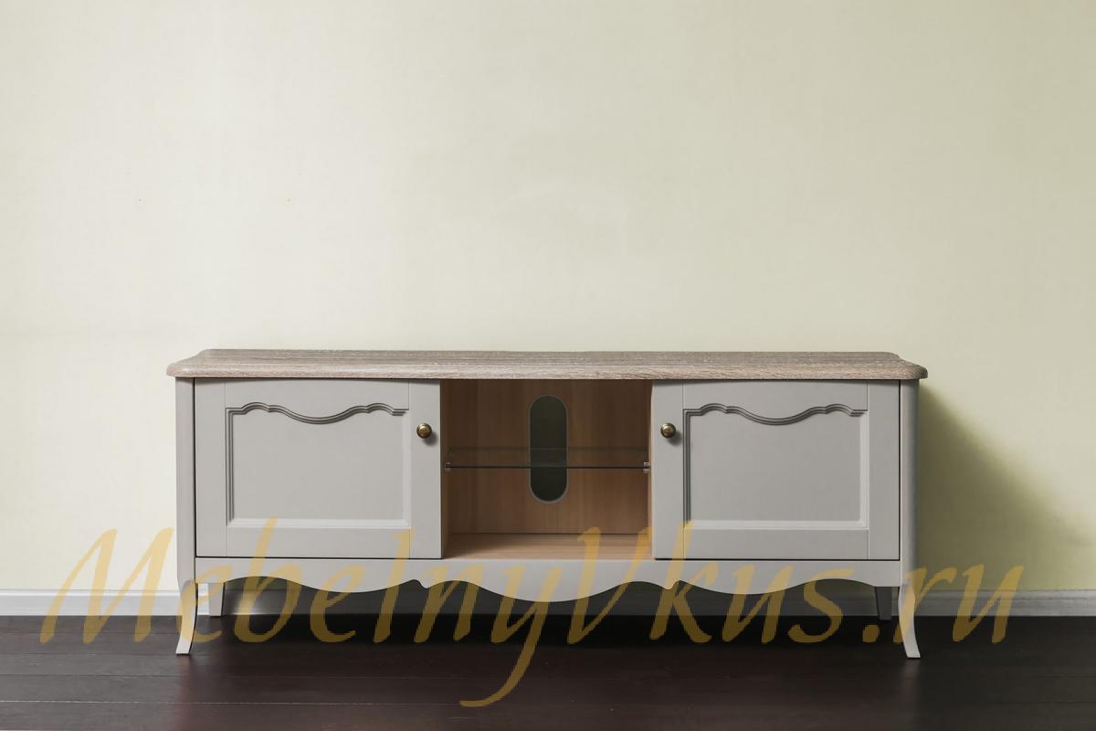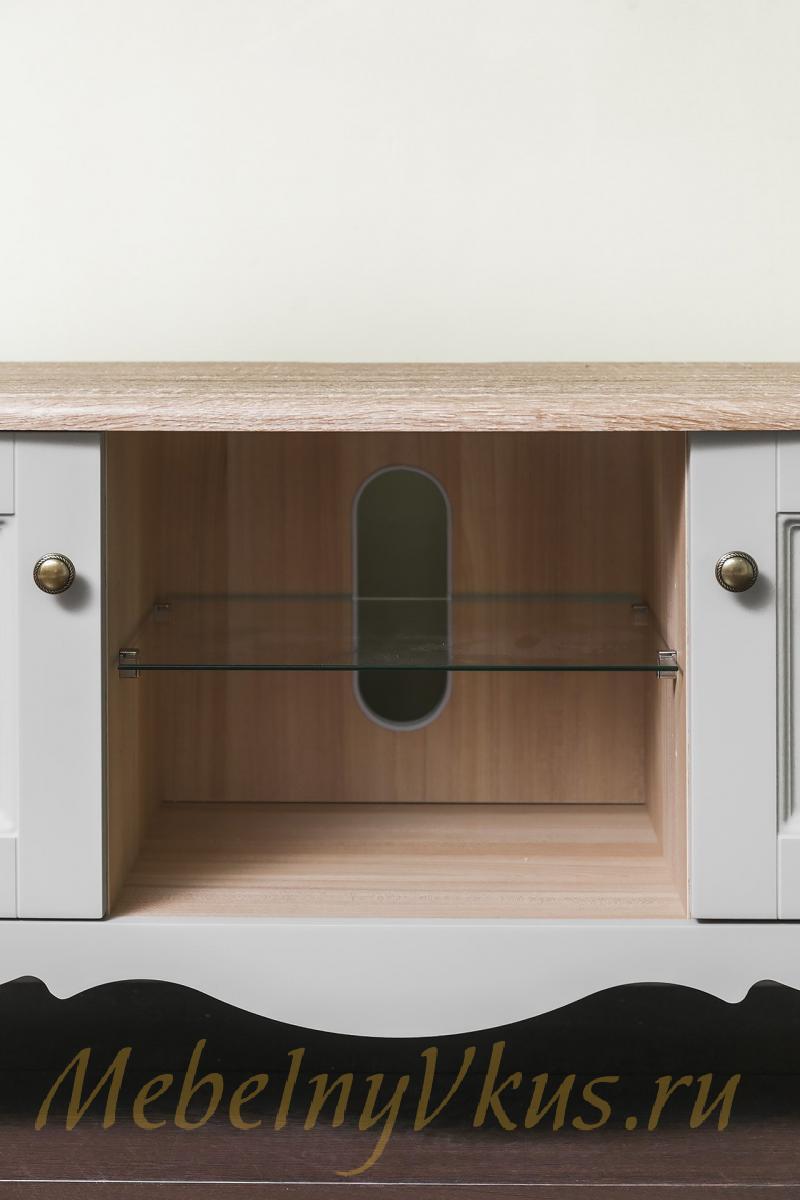 Высокая тумба под телевизор с большой нишей под аппаратуру и двумя отсеками с распашными дверцами. Стиль классический, прованс. В нише установлена стеклянная полка, с возможностью крепления на трех уровнях по высоте: 10, 16 или 22 см.. Для проводки кабелей в задней стенке ниши имеется отверстие, а в крышке, со стороны стены, - выемка. Крышка тв-тумбы имеет элегантную криволинейную форму, с фаской по всему периметру. Габариты изделия указаны по крайним точкам крышки. Поставляется в собранном виде, в картонной коробке с усиленными углами.