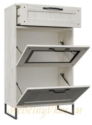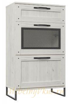 • Внизу 2 отделения за откидными дверями высотой 352 мм каждая. Верхняя откидная дверь со стеклянной вставкой (стекло с рисунком), нижняя дверь с глухой вставкой из ХДФ.