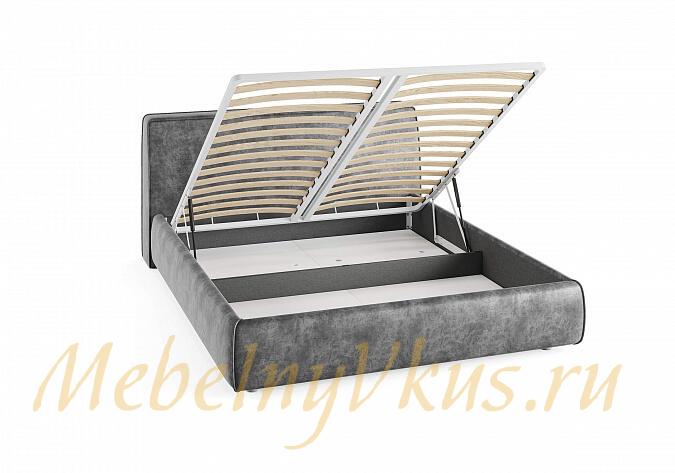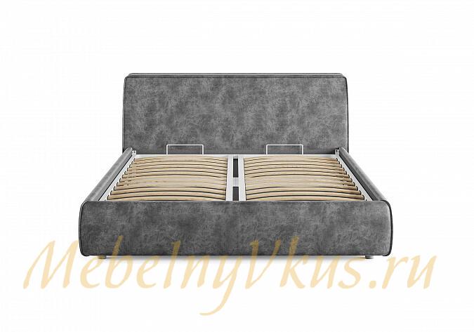 Современная и стильная интерьерная кровать. Модель изготовлена из ДСП и ДВП. В комплект кровати входит кроватное основание. Каркас основания выполнен из металла, ламели - из берёзы. При необходимости в комплект можно включить подъемный механизм с бельевым ящиком, который существенно увеличит объем хранения вещей, а так же позволит легко производить уборку пыли под кроватью.