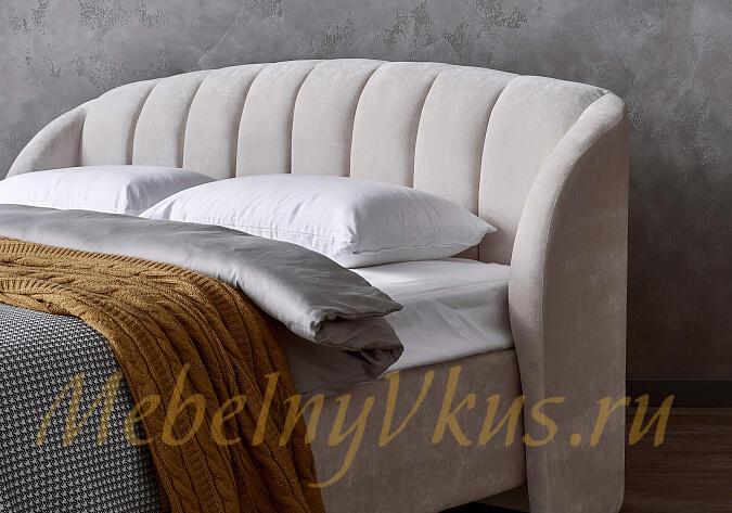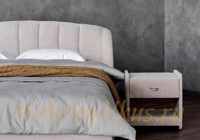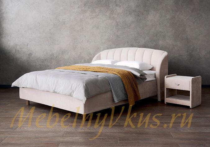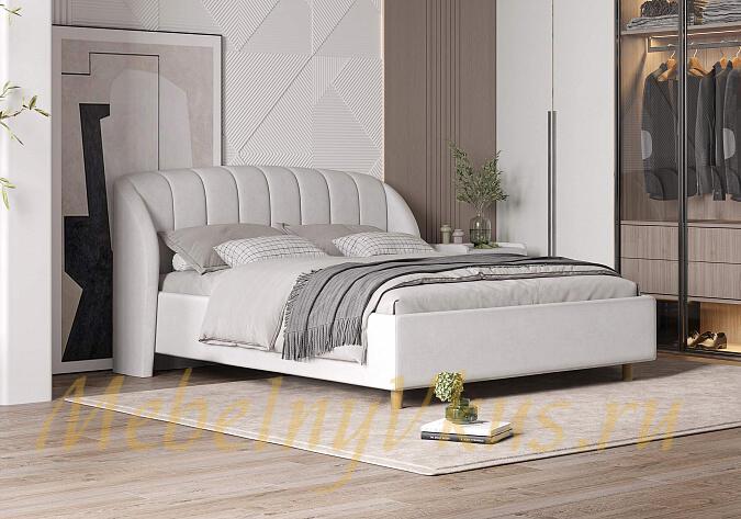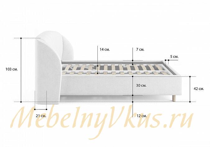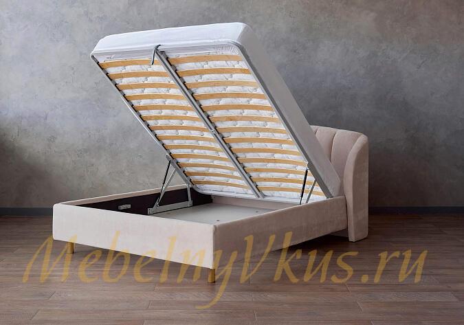 Современная и стильная интерьерная кровать. Модель изготовлена из ДСП и ДВП. В комплект кровати входит кроватное основание. Каркас основания выполнен из металла, ламели - из берёзы. При необходимости в комплект можно включить подъемный механизм с бельевым ящиком, который существенно увеличит объем хранения вещей, а так же позволит легко производить уборку пыли под кроватью.