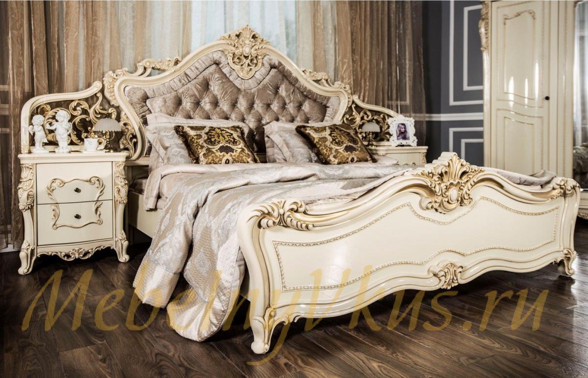 Мебель для спальни «Джоконда» не отличается прямыми линиями, здесь все очертания имеют криволинейные формы, преобладает архитектурный декор со сложными спиралями и витыми колоннами. Это дворцовый стиль, который использовали люди высшего класса в своих домах.