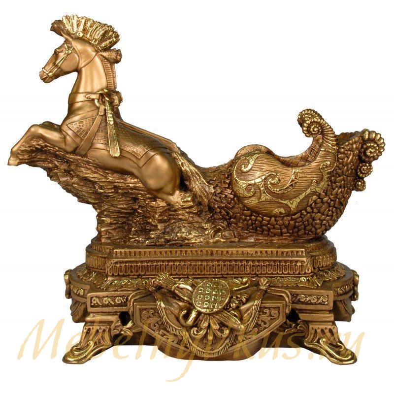 Эта необычная подставка под бутылку может стать хорошим подарком истинному ценителю вина. Она хорошо смотрится на камине, в центре большого праздничного стола или в стеклянном серванте, подобными предметами часто декорируют дорогие рестораны и гостиницы. Подставка представляет собой мчащихся коней в сбруе, запряженных в колесницу.