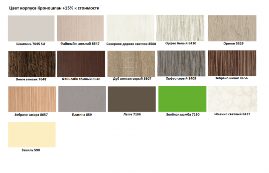 Обратите внимание наценка 15% к стоимости за цвет: шампань 7045SU, файнлайн светлый 8547, северное дерево светлое 8508, орфео белый 8410, орегон 5529, венге винтаж 7648, файнлайн тёмный 8548, дуб винтаж серый 5507, орфео серый 8409, зебрано нюанс 8656, зебрано сахара 8657, платина 859, латте 7166, зелёная мамба 7190, именио светлый 8413, ваниль 590.