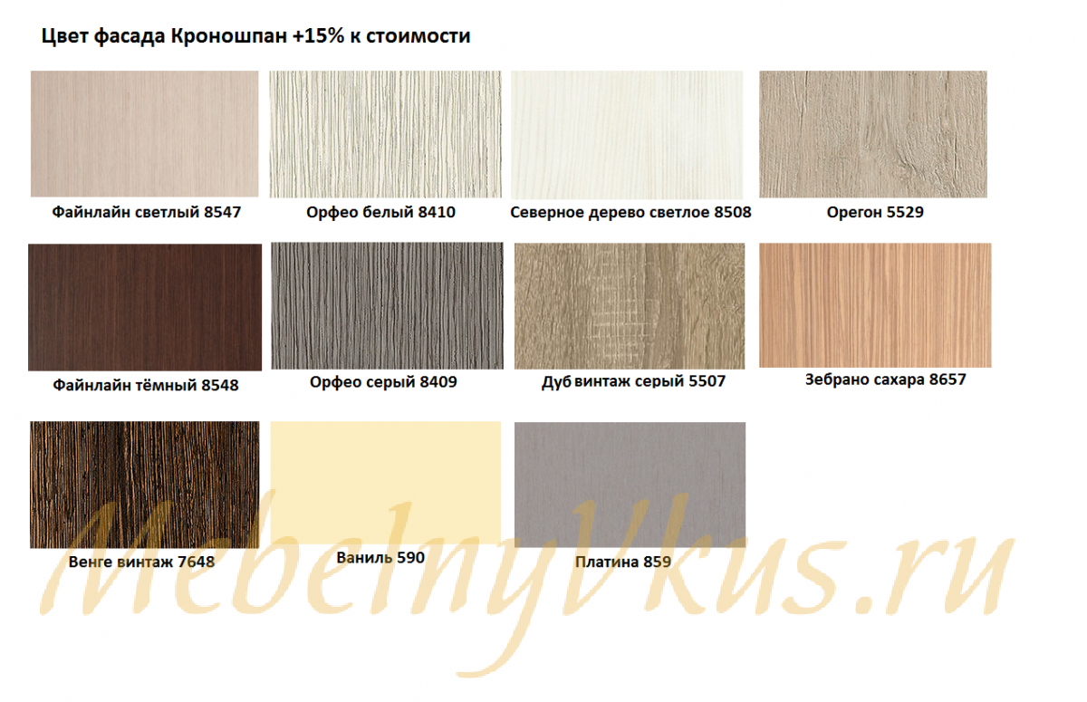 Обратите внимание наценка 15% к стоимости за цвет: шампань 7045SU, файнлайн светлый 8547, северное дерево светлое 8508, орфео белый 8410, орегон 5529, венге винтаж 7648, файнлайн тёмный 8548, дуб винтаж серый 5507, орфео серый 8409, зебрано нюанс 8656, зебрано сахара 8657, платина 859, латте 7166, зелёная мамба 7190, именио светлый 8413, ваниль 590.